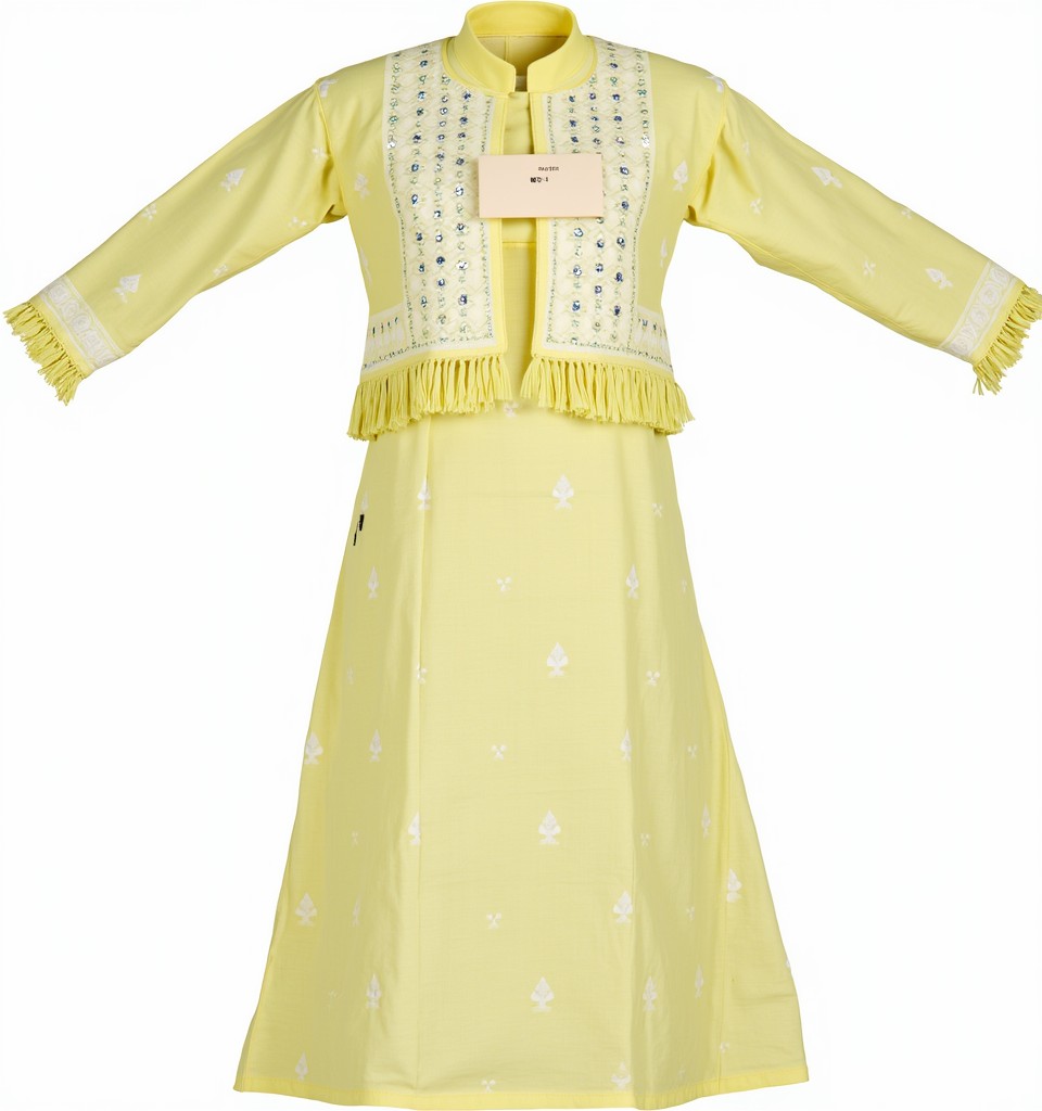 Step into grace with this charming yellow Anarkali kurta paired with an intricately embroidered short jacket. Crafted from soft, breathable fabric, this ensemble features delicate white threadwork, enhancing its ethnic charm. The full sleeves with frilled cuffs and tassel details on the jacket add a touch of elegance, making it perfect for festive occasions, casual outings, or even a summer wedding. The flowy silhouette ensures comfort while keeping you effortlessly stylish.